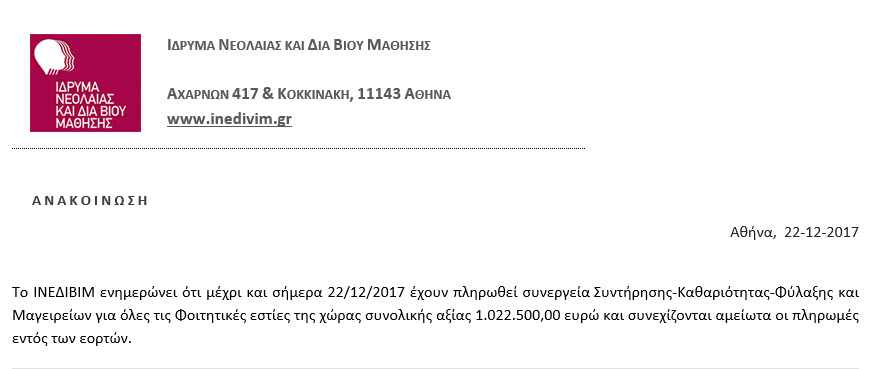 22-12-17 Ι.ΝΕ.ΔΙ.ΒΙ.Μ : Οι πληρωμές του Ι.ΝΕ.ΔΙ.ΒΙ.Μ για τα συνεργεία Συντήρησης-Καθαριότητας-Φύλαξης και Μαγειρείων για όλες τις Φοιτητικές εστίες της χώρας