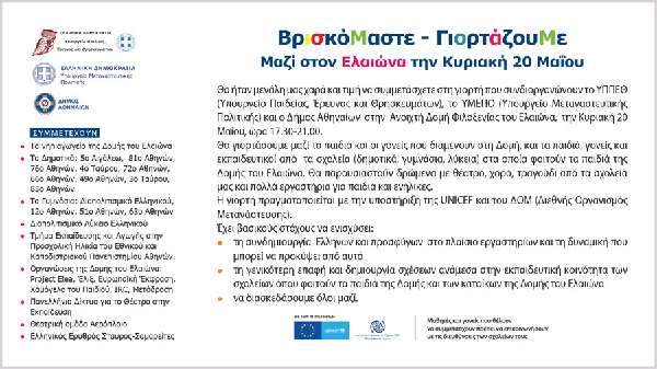 Με σύνθημα «Βρισκόμαστε – Γιορτάζουμε Μαζί στον Ελαιώνα», τα παιδιά, οι γονείς και οι εκπαιδευτικοί 15 σχολείων της Αθήνας και της Ανοιχτής Δομής Φιλοξενίας του Ελαιώνα, πραγματοποιούν την Κυριακή 20 Μαΐου, μια μεγάλη γιορτή.
