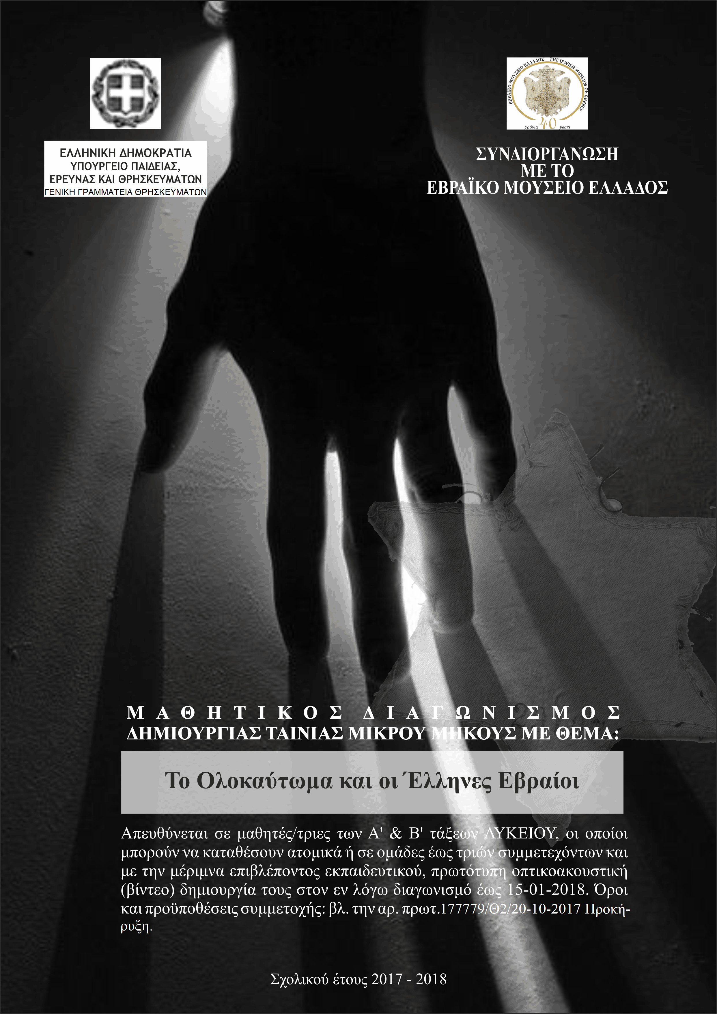 Η Γενική Γραμματεία Θρησκευμάτων του Υπουργείου Παιδείας, Έρευνας και Θρησκευμάτων και το Εβραϊκό Μουσείο της Ελλάδος διοργανώνουν μαθητικό διαγωνισμό δημιουργίας βίντεο με θέμα: «Το Ολοκαύτωμα και οι Έλληνες Εβραίοι».