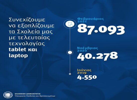 65.965 φορητές συσκευές αξίας άνω των 20 εκ. ευρώ μέσω ΕΣΠΑ και 25.648 φορητές συσκευές αξίας άνω των 4 εκατομμυρίων ευρώ μέσω δωρεών έχει εξασφαλίσει το Υπουργείο Παιδείας για τις σχολικές μονάδες πρωτοβάθμιας και δευτεροβάθμιας εκπαίδευσης όλης της χώρας, ανταποκρινόμενο στις πρωτόγνωρες συνθήκες που προκάλεσε η πανδημία του κορωνοϊού, δρομολογώντας τον επιπλέον εξοπλισμό ήδη από την άνοιξη.
